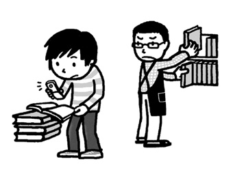 印刷媒体(雑誌か新聞)の、本屋に並んでいる本の中身を、携帯電話で写真に撮って買わない「立ち撮り」を禁止する広告へのイラストレーション